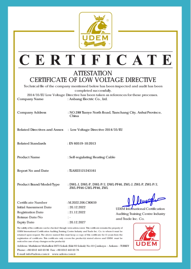 安邦電氣股份有限公司,總部位于北京市長安街,成立于2004年,注冊資金10088萬。安徽生產基地占地面積63000平方米,擁有66套各類生產線,其中進口生產線6套。國家高新技術型企業,滁州市市長質量獎企業,專精特新“小巨人”企業,擁有國家知識產權局授權的45項專利,其中發明專利28項 , 主筆《太陽能熱利用自限溫電熱帶安裝規范》行業標準,參編《自限溫電伴熱帶》國家標準、《工業和商業用電阻式伴熱系統》國家標準、《太陽能熱利用自限溫電熱帶》行業標準、《爆炸性環境 電阻式伴熱器》國家標準等7項國家標準。企業通過UL認證,國家強制性 CCC產品認證,ISO9001質量管理體系認證,ISO14001環境管理體系認證,ISO45001職業健康安全管理體系認證,Q/SHS0001.1健康、安全與環境管理體系認證,歐盟防爆ATEX認證,歐盟CE認證,RoHS認證,俄羅斯海關聯盟認證,國家防爆電氣CCC證書。產品系列:集膚伴熱系統、電伴熱系統、電加熱器、電地暖系統、集儀器儀表、電線電纜、高低壓配電柜(箱)、電纜橋架、閥門管件等等設計、制造、銷售。產品應用于航天航空、軍工、石油、石化、天然氣、機場、化工、鋼鐵、隧道、消防、養殖、融雪化冰、室內供暖、國家電網及眾多電廠等等國家重點工程。出口美國、英國、德國、俄羅斯、韓國、日本、哈薩克斯坦、烏克蘭、伊朗等眾多國家。